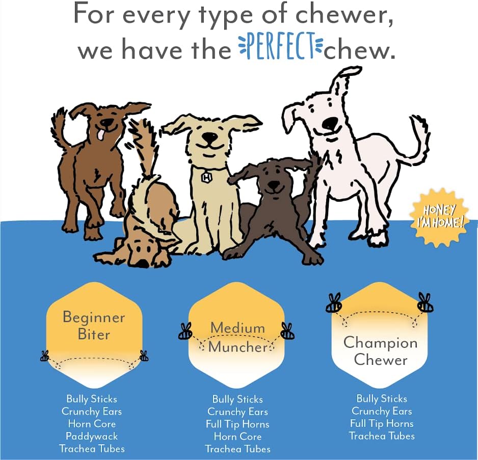 Our Bully Sticks provide a protein-rich and satisfying chewing experience that dogs absolutely adore! Made with simple, easy-to-understand ingredients like buffalo pizzle and honey, these treats not only taste great but also offer excellent digestibility. As your dog chews, the action helps promote healthy teeth and gums, making them an ideal treat for dental health. Coated in sweet honey, these energy-packed chews are sure to keep your pup happy and engaged, providing both enjoyment and nutritional benefits.