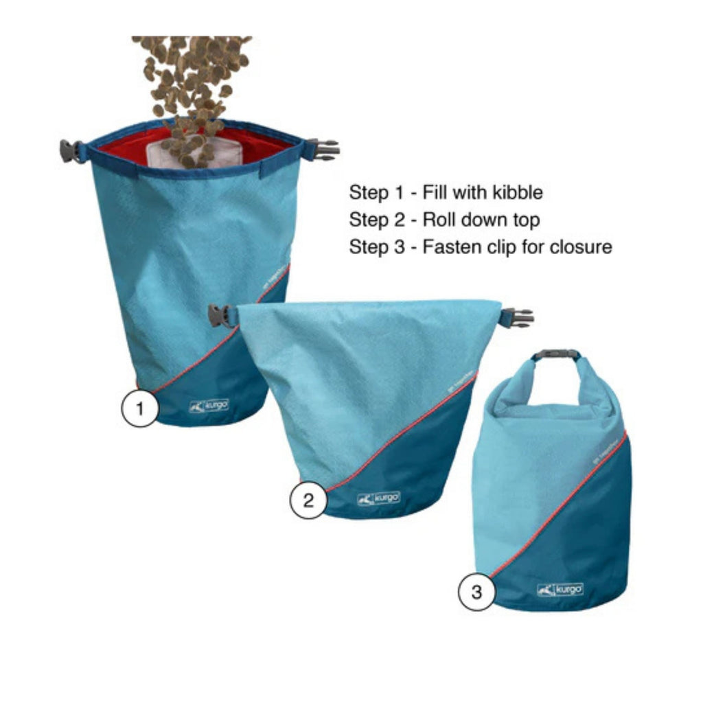 The Kibble Carrier is constructed from tough ripstop material, so your dog can rest easy knowing her kibble is safe and all is right with the world. Engineered like a waterproof river bag, the top rolls and clips, ensuring security and freshness. The open pocket on the bottom is perfect for a Collaps-A-Bowl (not included). The zippered side pocket is perfect for extra treats (your dog just whispered that to us).
